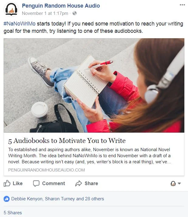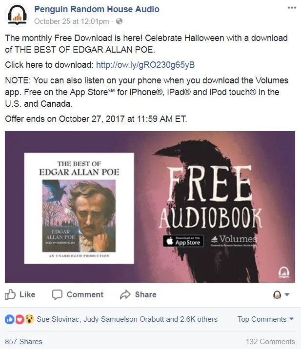 Boosted Facebook post to lead traffic to PRH Audio's site.